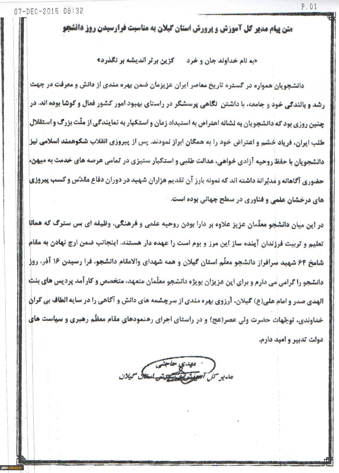 امتیاز دهید : متن سخن مدیر کل آموزش و پرورش به مناسبت 16آذر (روز دانشجو) دوشنبه 16 آذر 1394 ساعت 15:53