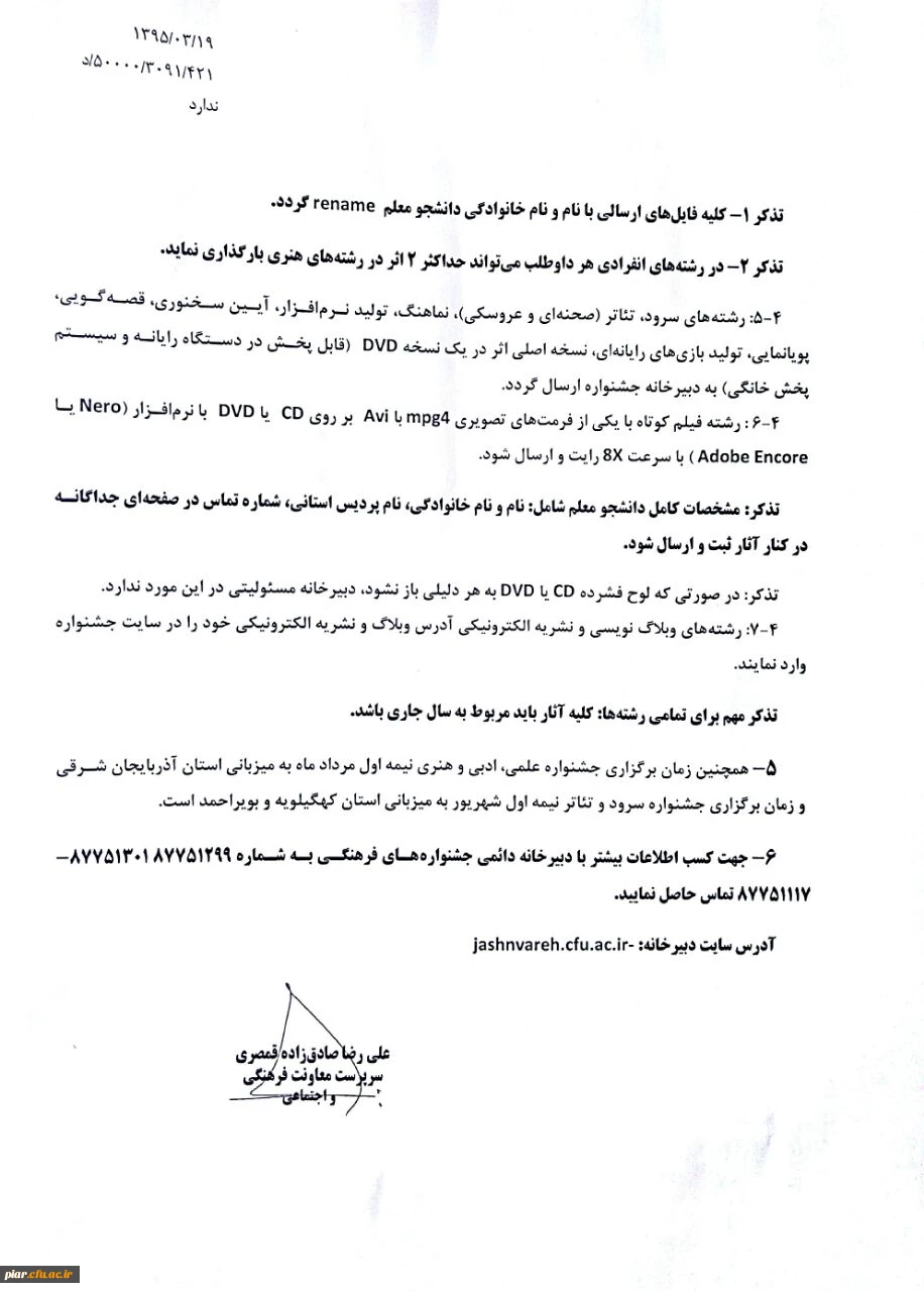 قابل توجه منتخبین بیست و ششمین جشنواره علمی ،ادبی و هنری