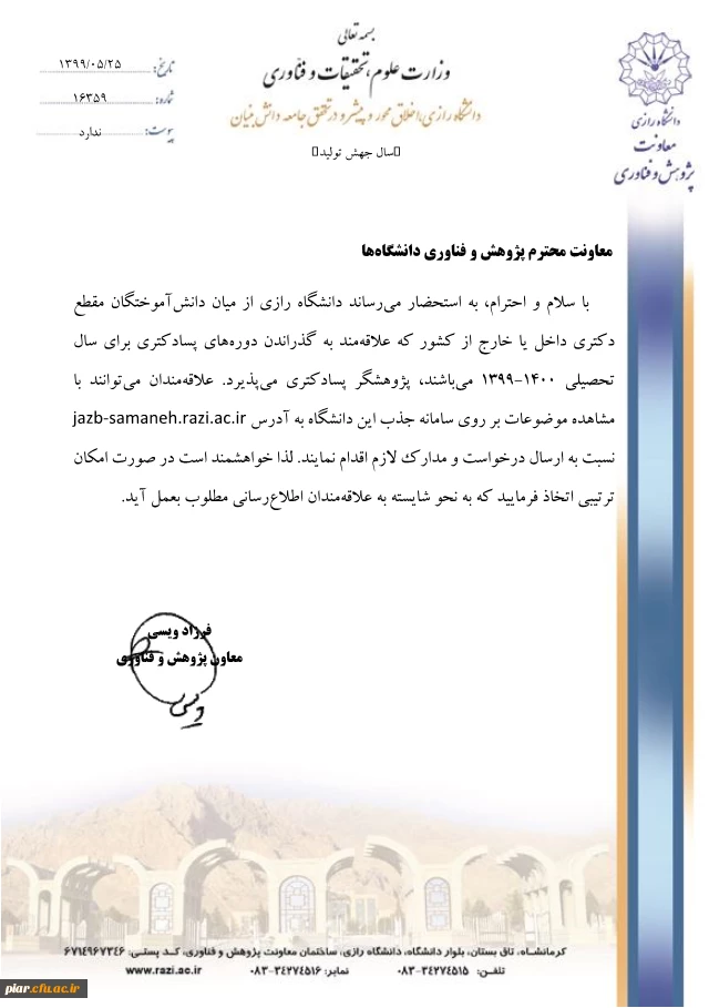 امتیاز دهید : پذیرش پژوهشگر دوره پسا دکتری دانشگاه رازی برای سال تحصیلی 1400-1399 3 شنبه 1 شهریور 1399 ساعت 14:35