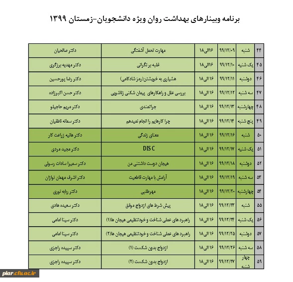 امتیاز دهید : کارگاه های آموزشی آنلاین با هدف ارتقاء بهداشت روان (دوره زمستان 99) ویژه دانشجویان 2 سهشنبه 9 دی 1399 ساعت 12:17